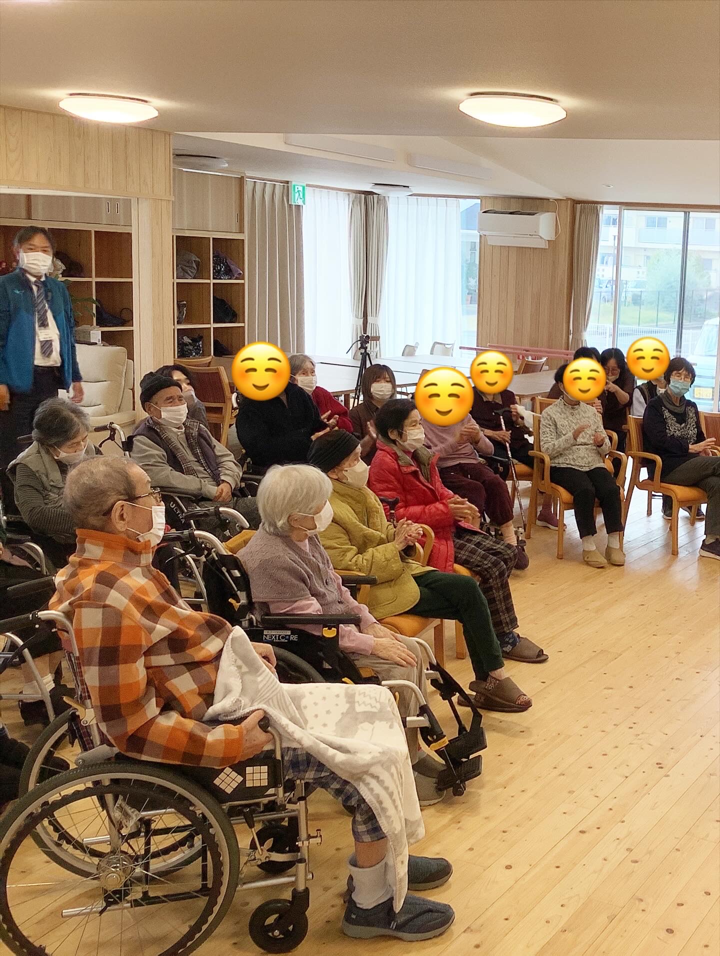 デイサービスご利用の方と、画図重富苑グループの特養にご入居されておられる方、ショートステイご利用中の方とたくさんの方に集まって頂き、歌に合わせて手拍子をしたり、一緒に口ずさんだりと大盛り上がりでした🎵