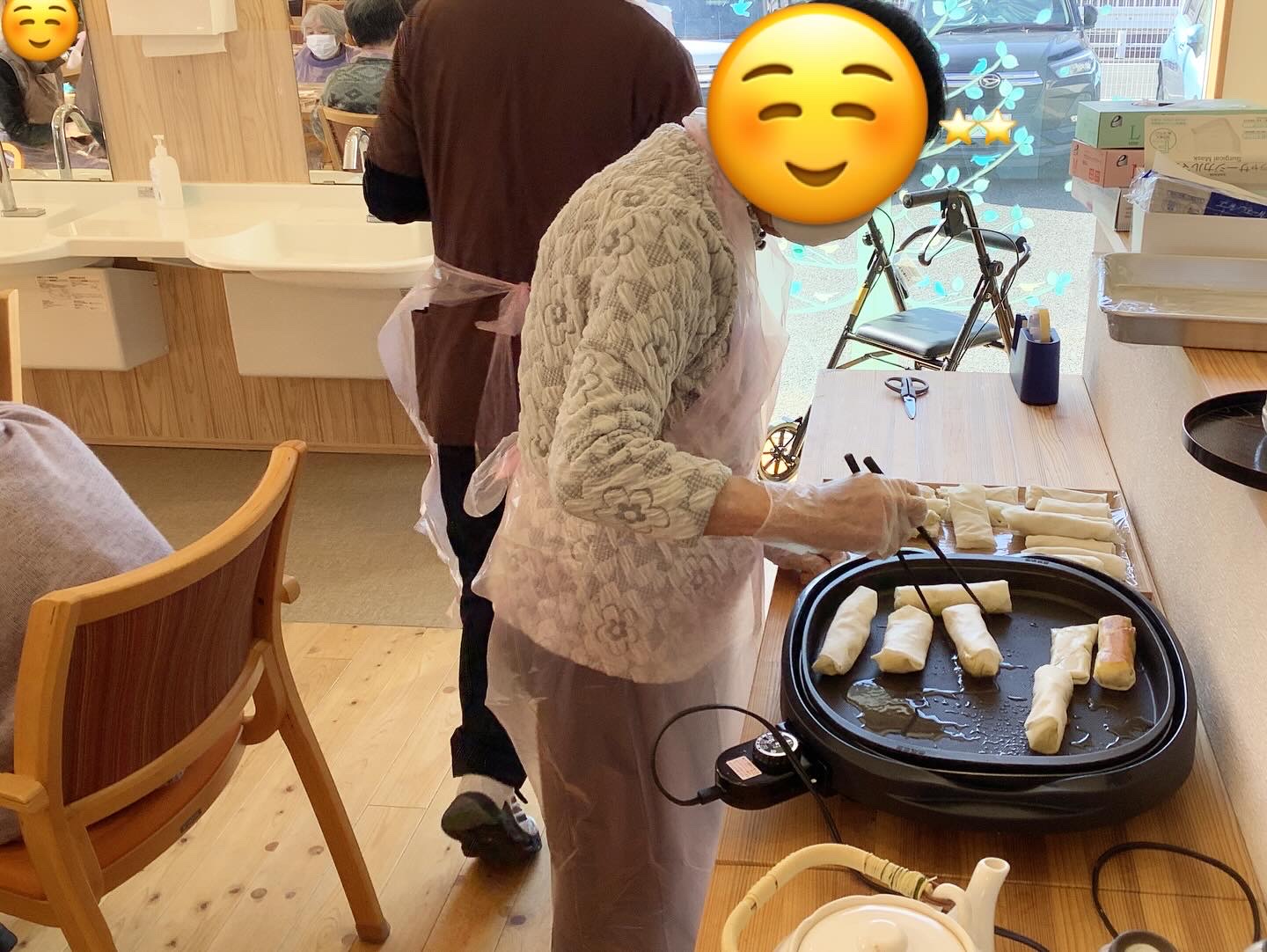 春巻きの皮に丁寧に包んでいただきながら、「前に料理の先生をしていました!」「こんなにはいるかなー」とお話しも聞かれ、楽しいおやつ作りとなりました🎵