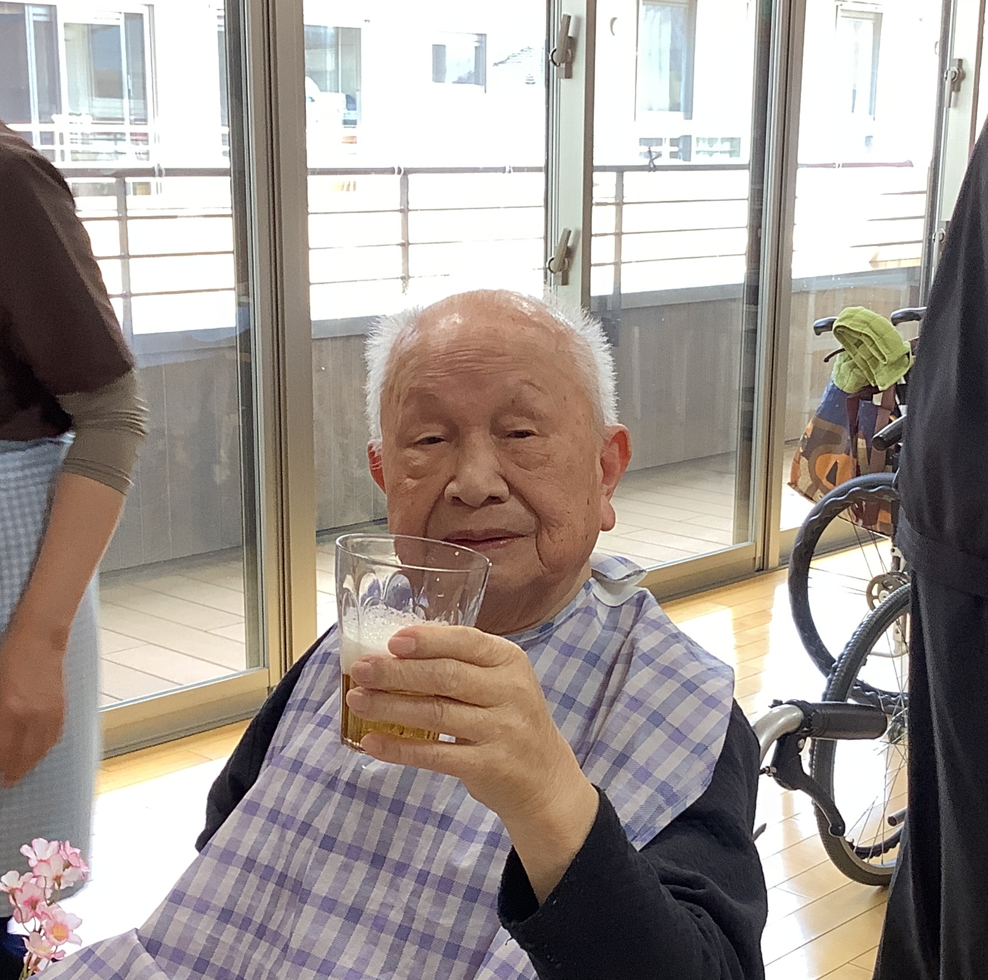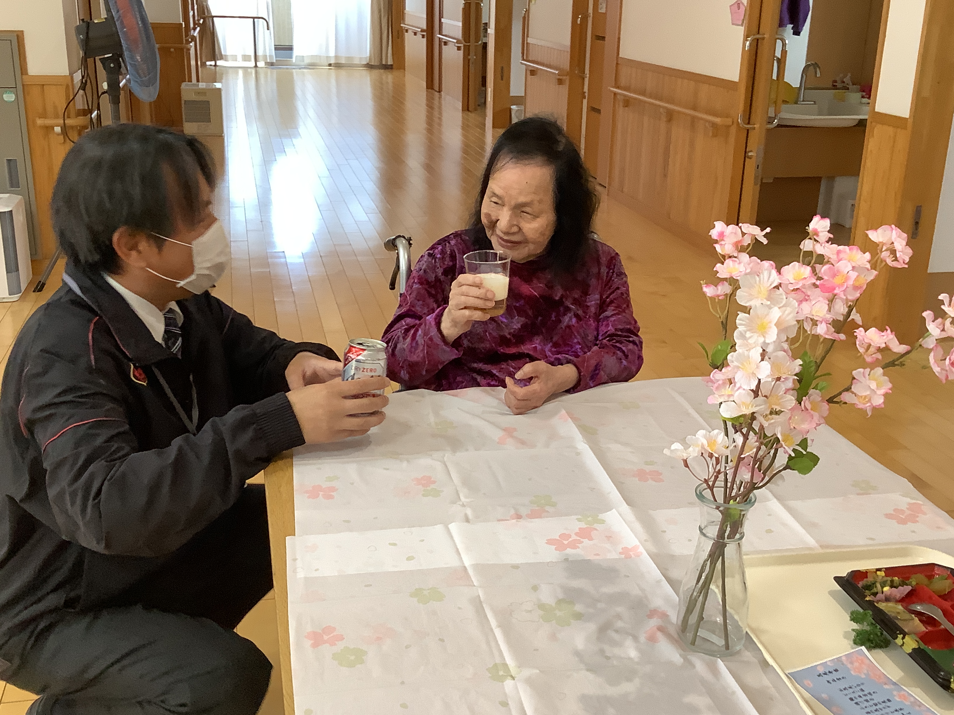 お花見気分をより楽しんでいただけるよう、お部屋には春らしい飾り付けを施し、お弁当のお供にはお茶と、ノンアルコールではありますがビールもご用意しました✨