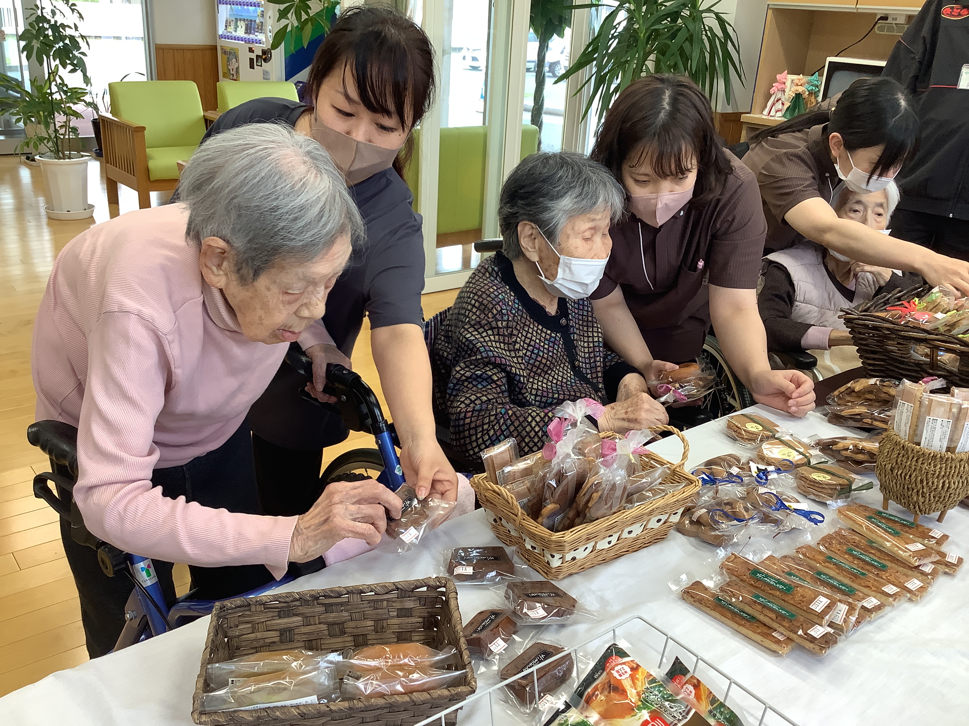 当日はショートステイやデイサービスのご利用者様、特養の入居者様、そして職員も一緒になって、にぎやかにお買い物を楽しみました。