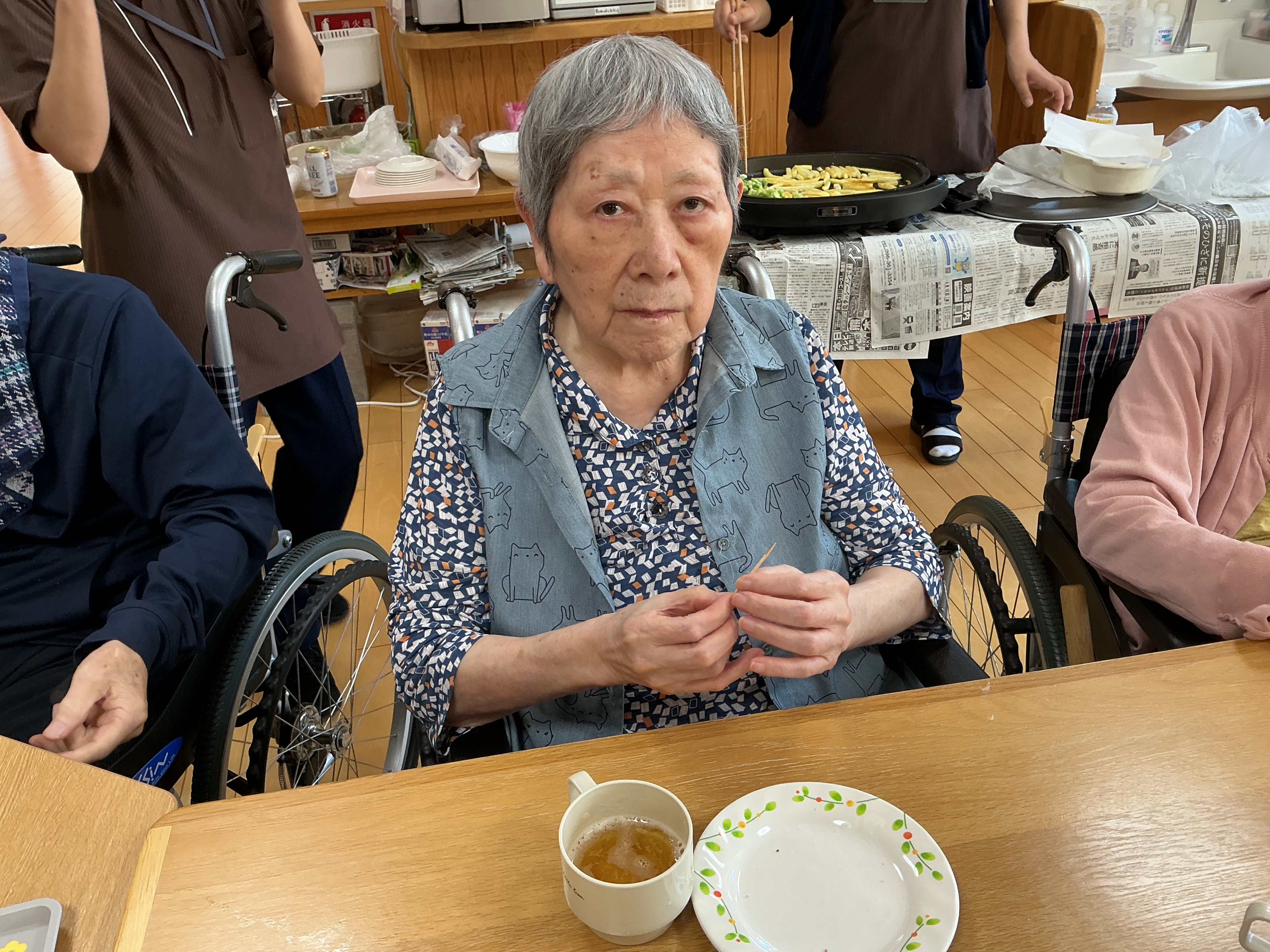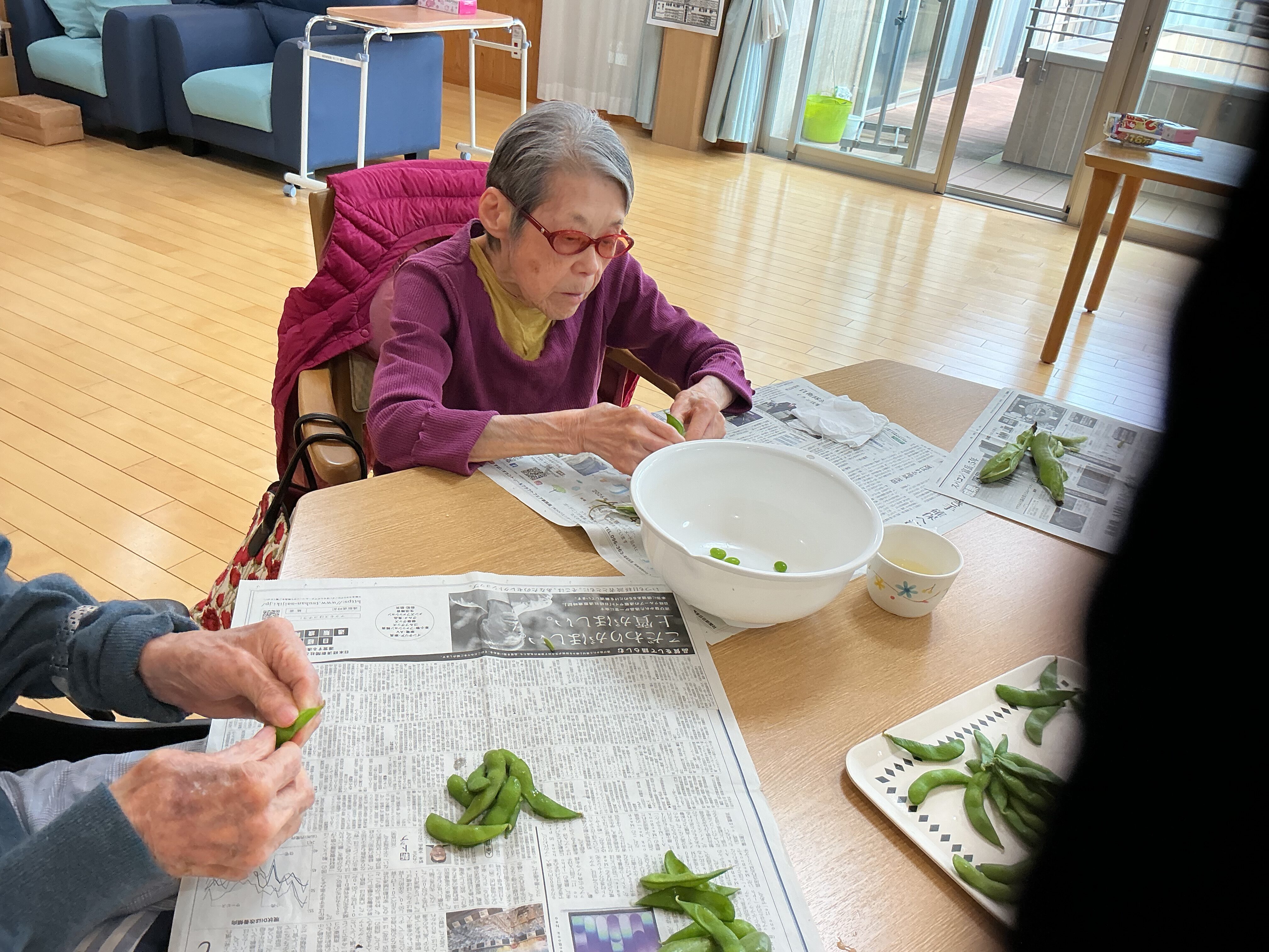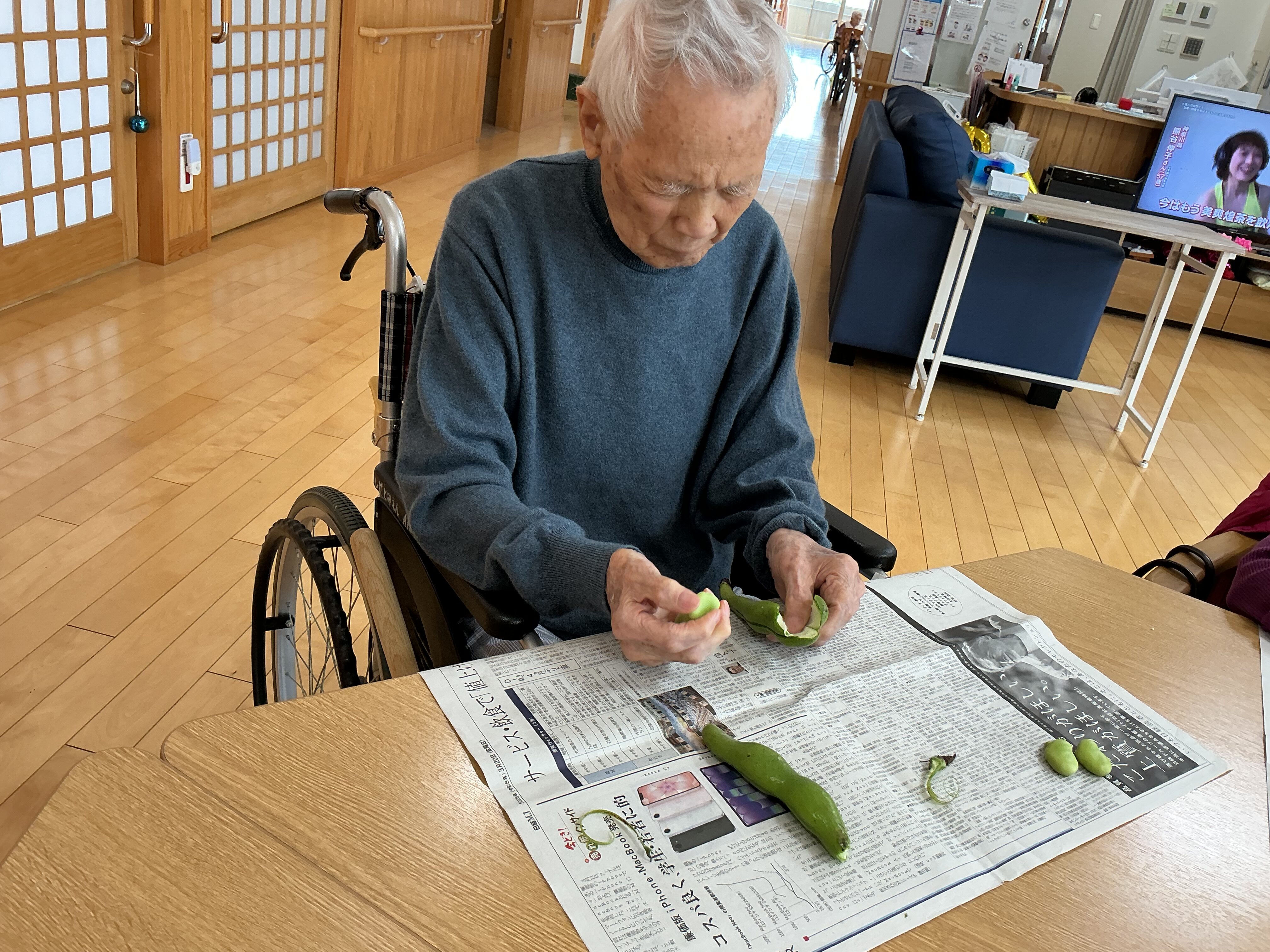 2026.04.24 ブログ 赤・青 おやつレク🫛 🌱そら豆の天ぷらで季節のおやつレク 今月の赤ユニット・青ユニットのおやつレクは、いつもの甘いおやつとは少し趣向を変えて、旬のそら豆の揚げ物を作りました。 大きくて立派なそら豆を、皆さんで下ごしらえ。手際よく進める方、ゆっくり丁寧に取り組まれる方、それぞれのペースで楽しみながら準備されていました。 ホットプレートで揚げると、そら豆の香りがふわっと広がり、思わず笑顔に。 次回のおやつレクもどうぞお楽しみに🎶 ページ送り お知らせ・ブログ一覧 前の記事へ 次の記事へ