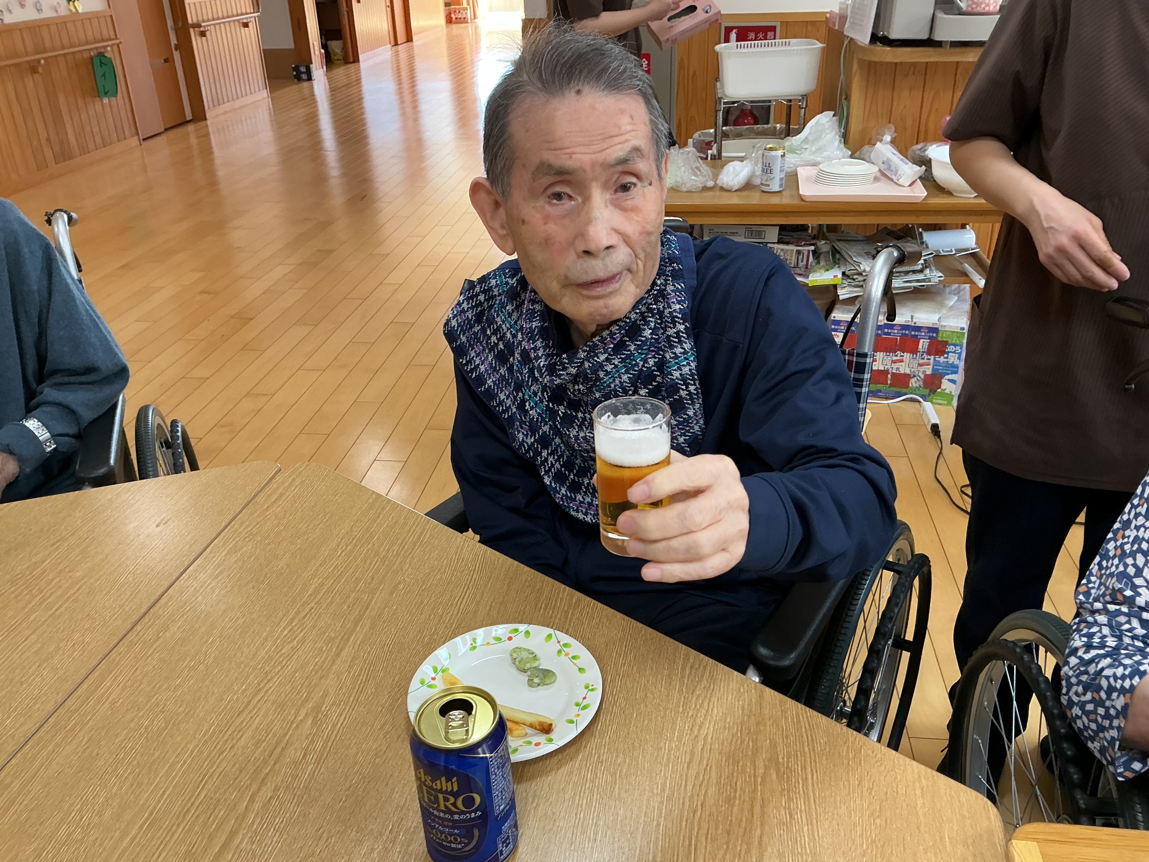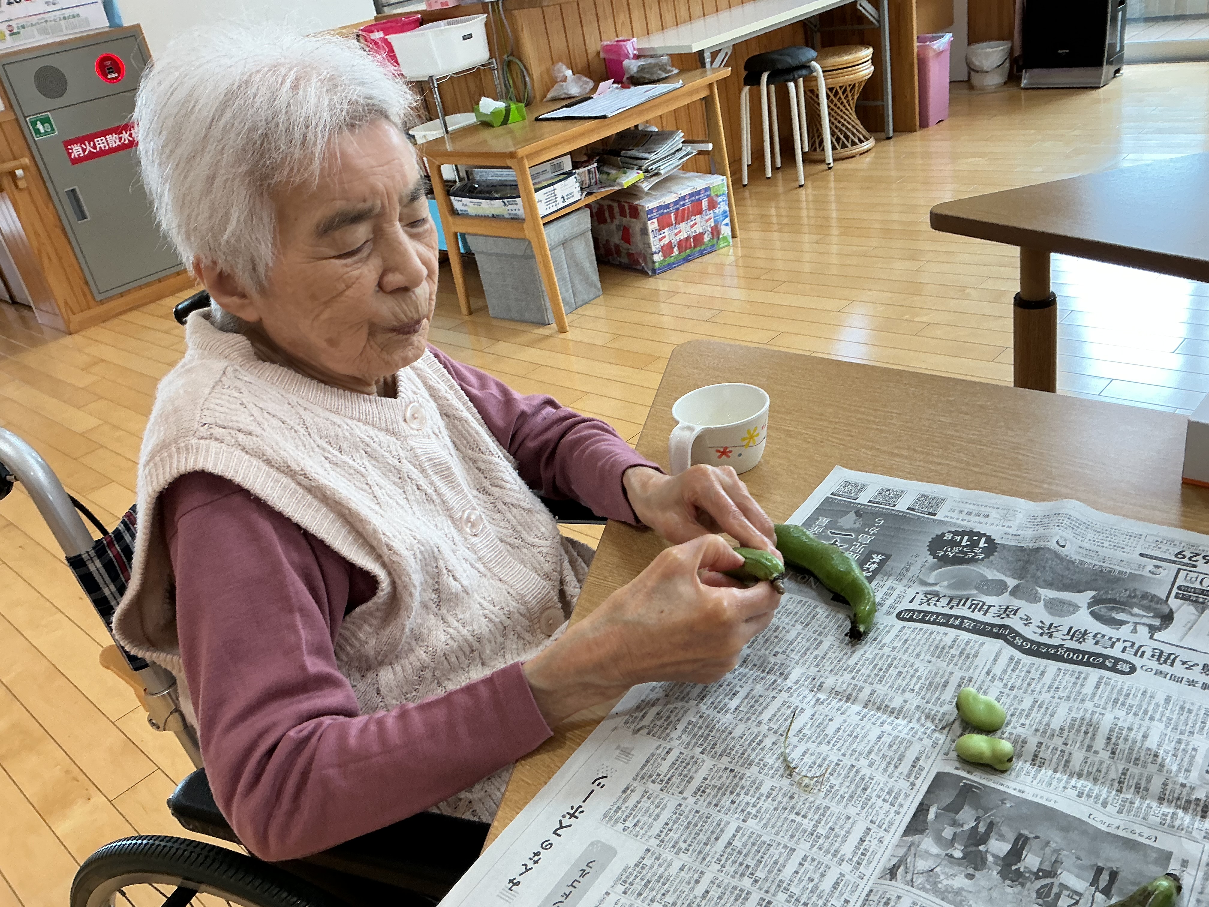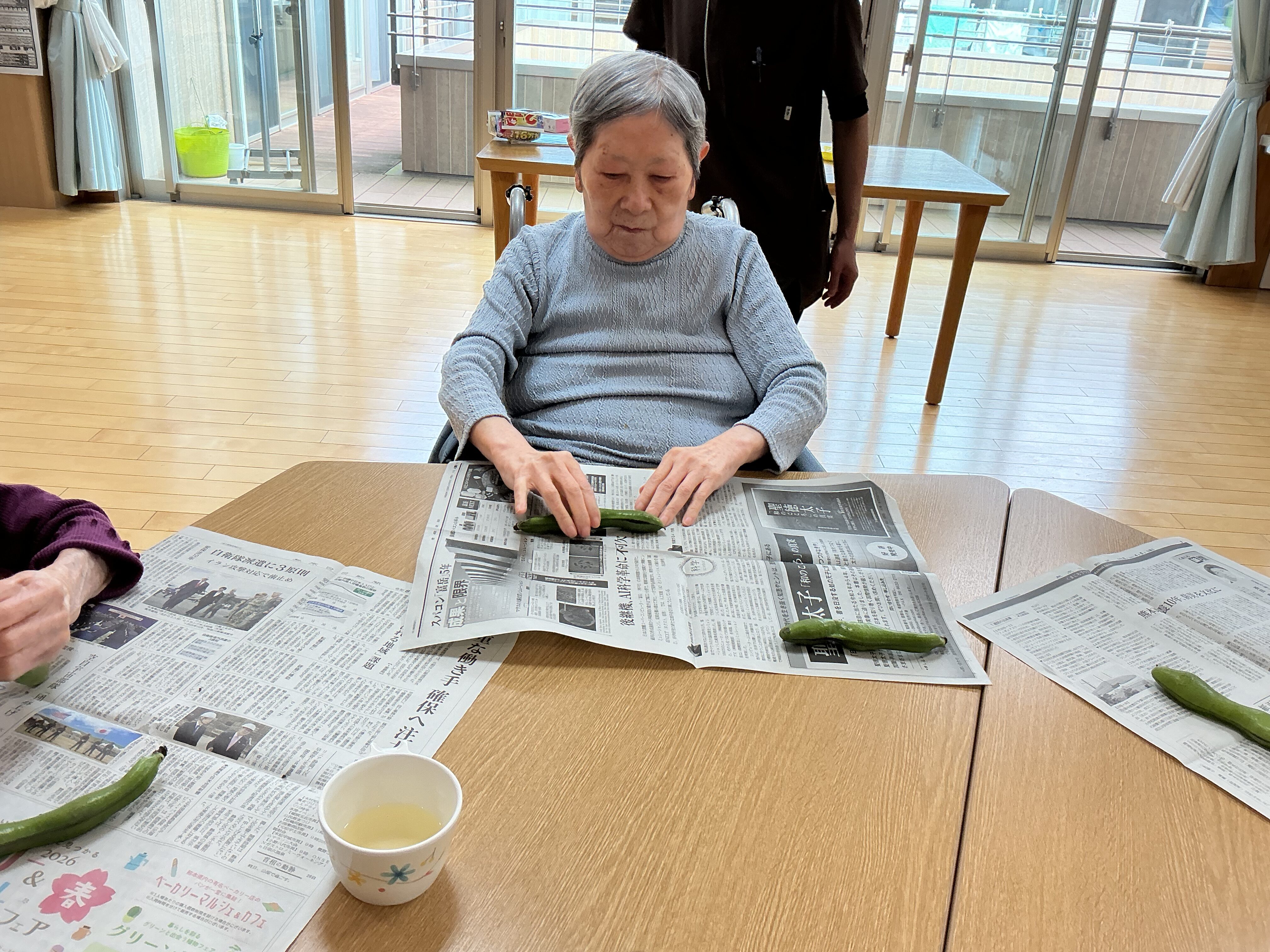 2026.04.24 ブログ 赤・青 おやつレク🫛 🌱そら豆の天ぷらで季節のおやつレク 今月の赤ユニット・青ユニットのおやつレクは、いつもの甘いおやつとは少し趣向を変えて、旬のそら豆の揚げ物を作りました。 大きくて立派なそら豆を、皆さんで下ごしらえ。手際よく進める方、ゆっくり丁寧に取り組まれる方、それぞれのペースで楽しみながら準備されていました。 ホットプレートで揚げると、そら豆の香りがふわっと広がり、思わず笑顔に。 次回のおやつレクもどうぞお楽しみに🎶 ページ送り お知らせ・ブログ一覧 前の記事へ 次の記事へ